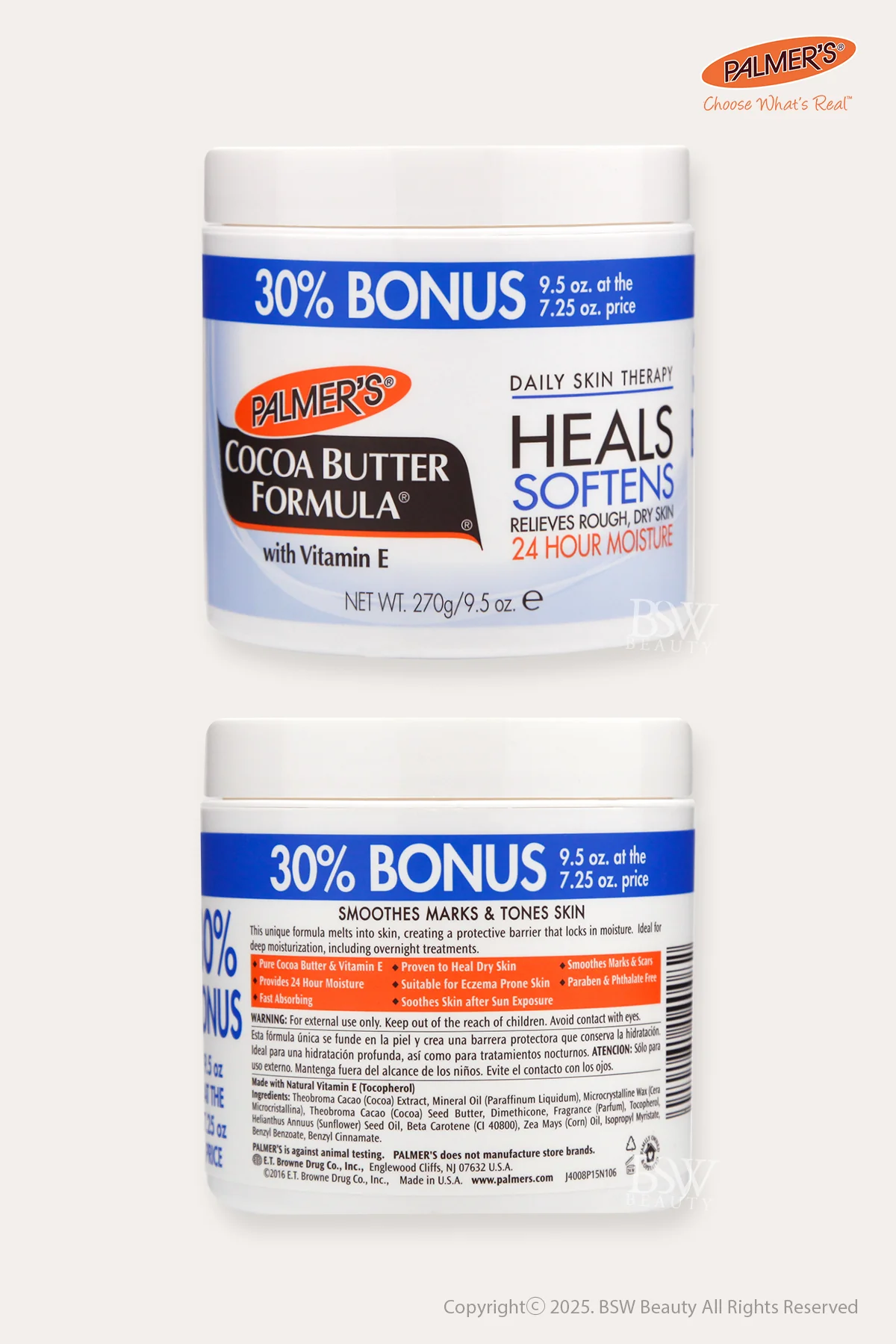 Le pot original Palmer’s au beurre de cacao hydrate en profondeur tout le corps. Contrairement à une lotion, une crème ou un onguent, cette formule unique de baume-lotion au beurre de cacao pur fond sur la peau dès son contact, créant une barrière protectrice qui retient l’hydratation pendant 48 heures.