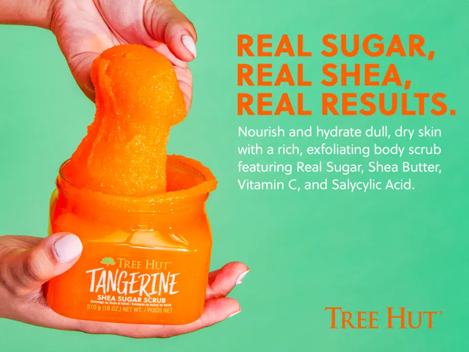 Les gommages au sucre de karité Tree Hut sont des gommages corporels exfoliants efficaces qui éliminent la peau terne et sèche pour révéler une peau éclatante, douce et lisse. Nous formulons avec de fortes concentrations d’ingrédients végétaux respectueux de la peau. Notre assortiment rehausse n’importe quelle routine de douche avec des ingrédients comme le beurre de karité, le beurre de cupuaçu, le sucre, l’huile d’avocat, l’huile de graines de macadamia, l’huile d’onagre, l’huile d’amande douce, l’huile de graines de chanvre, l’huile de noix de coco, le guarana, l’aloès, les enzymes de fruits, les extraits de fruits et vitamine C. Les gommages corporels et autres produits Tree Hut sont fièrement fabriqués sans parabènes ni sulfates.